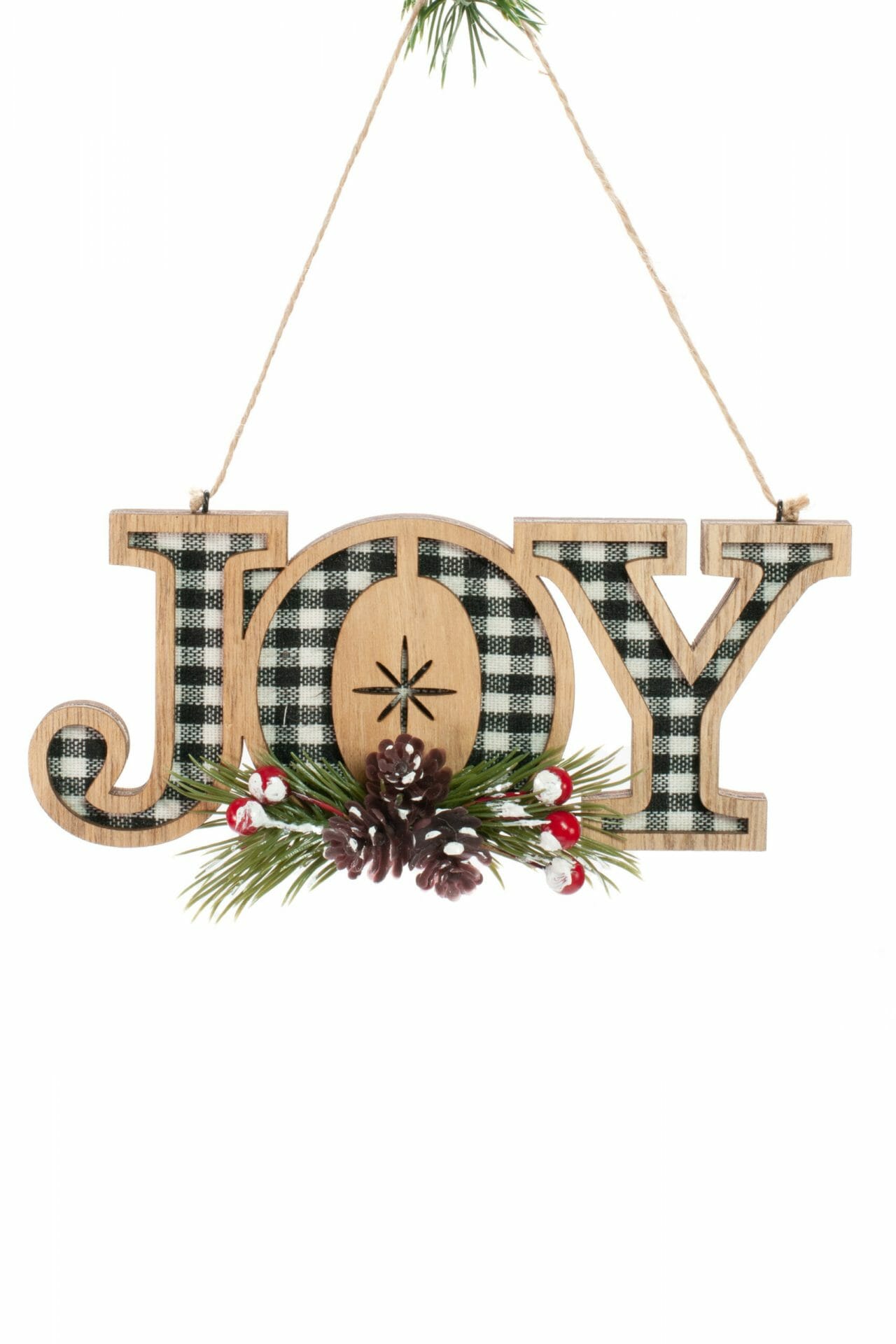 • Description: 8.5" Hanging Plaid Black and White Wood "Joy" Sign Ornament