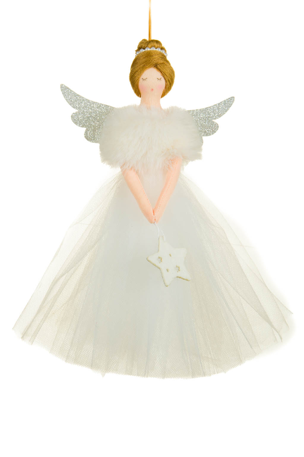 Sleepy Fancy Hanging Old White Solid Fabric Lady Ornament in White Dress Silver Wings