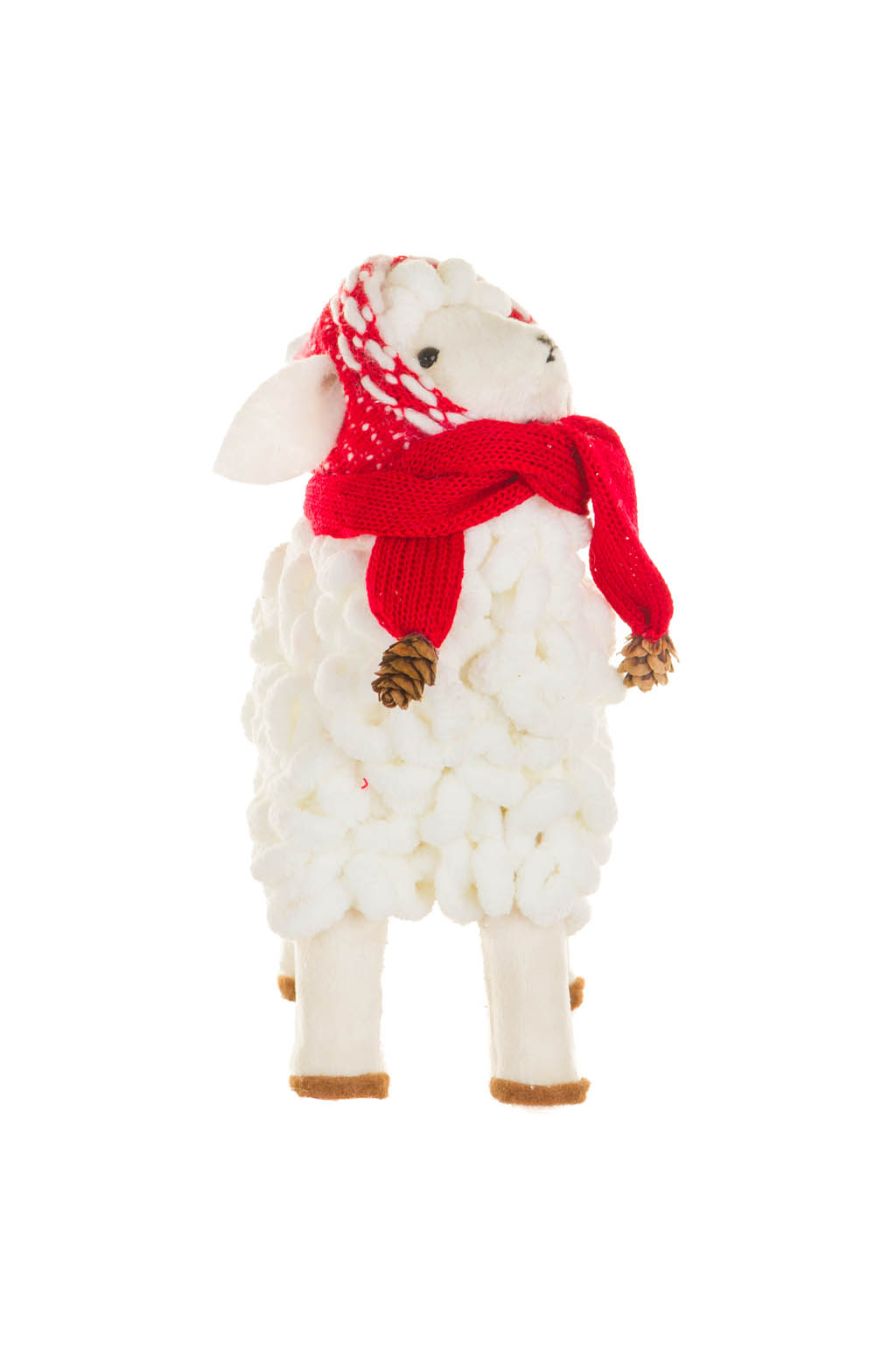 • Description: 5" White and Red Cotton Sheep Figurine with Winter Scarf